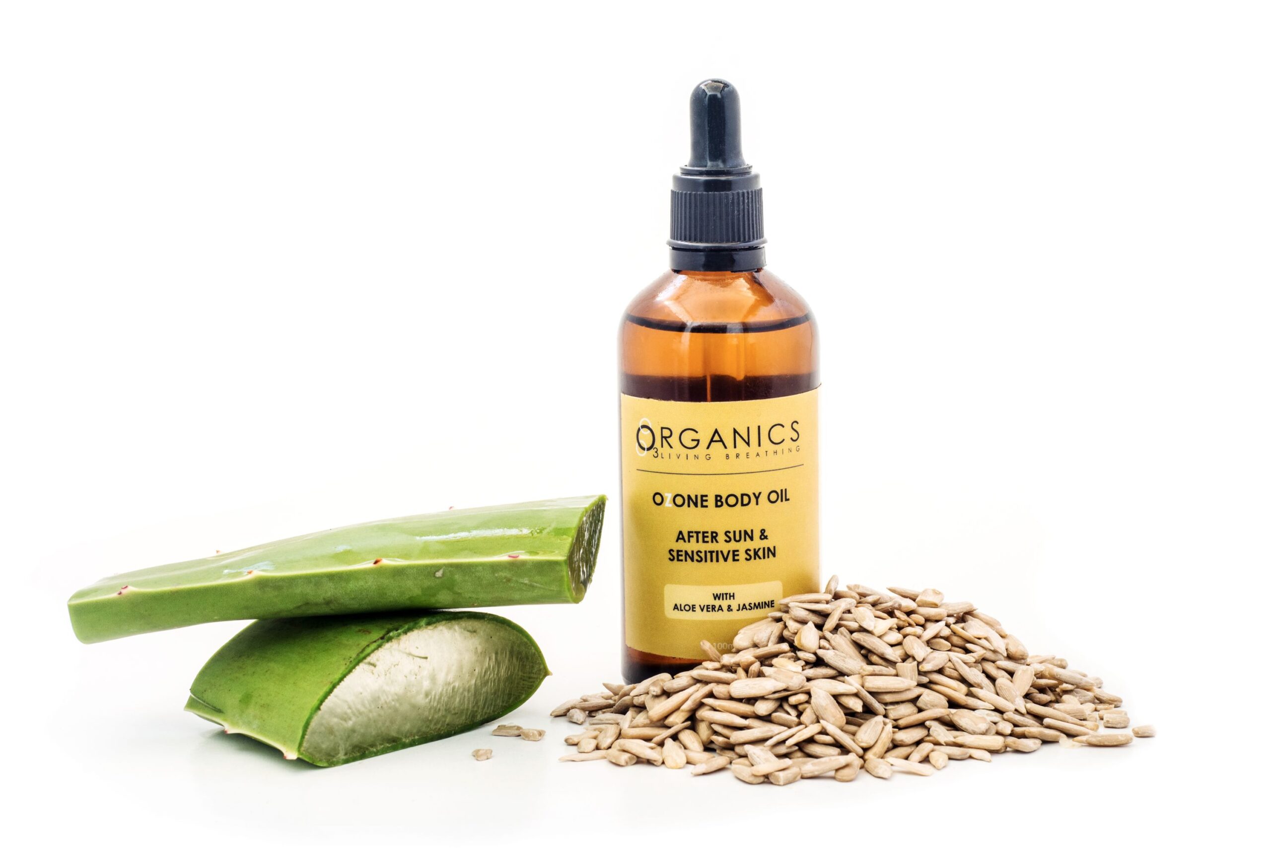 Aloe Barbadenis Miller (Aloe Vera Oil), Organic Helianthus Annuus (Sunflower Seed Oil), Organic Cocos Nucifera (Coconut Oil), Organic Jasminum (Jasmine Oil) Triatomic Oxygen (Ozone).